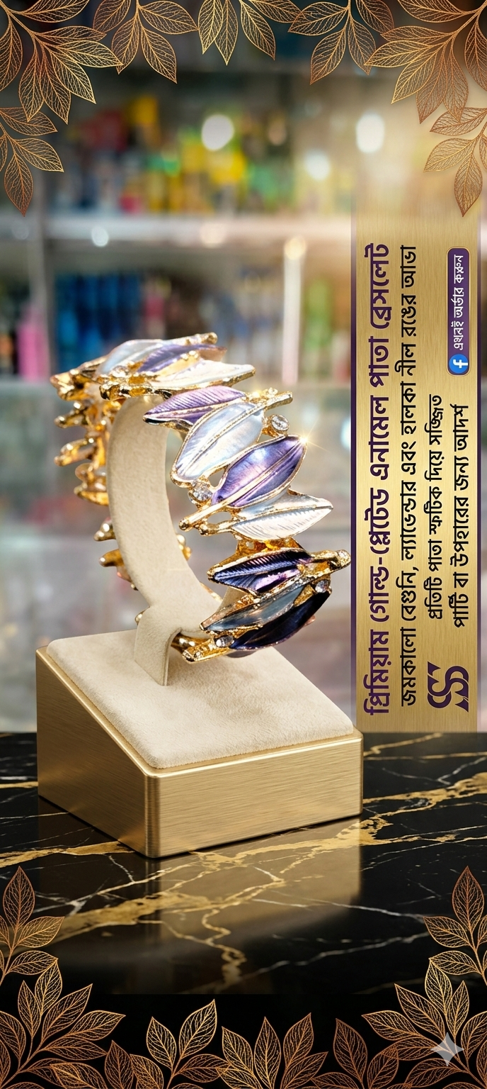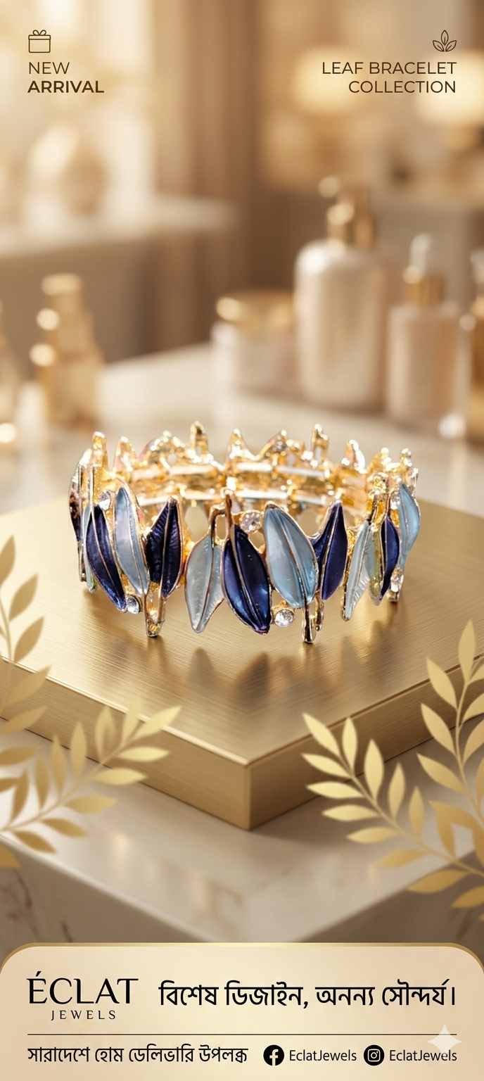 Product Description (ডেসক্রিপশন): আপনার সাধারণ সাজে আভিজাত্যের ছোঁয়া দিতে নিয়ে এলাম চমৎকার এই ফ্লোরাল লিফ ডিজাইন ব্রেসলেট সেট। এর প্রতিটি পাতা নিখুঁতভাবে নেভি ব্লু, আকাশি এবং সাদা এনামেল ফিনিশ দিয়ে তৈরি, যা সোনালী মেটালের ওপর অসাধারণ দেখায়।