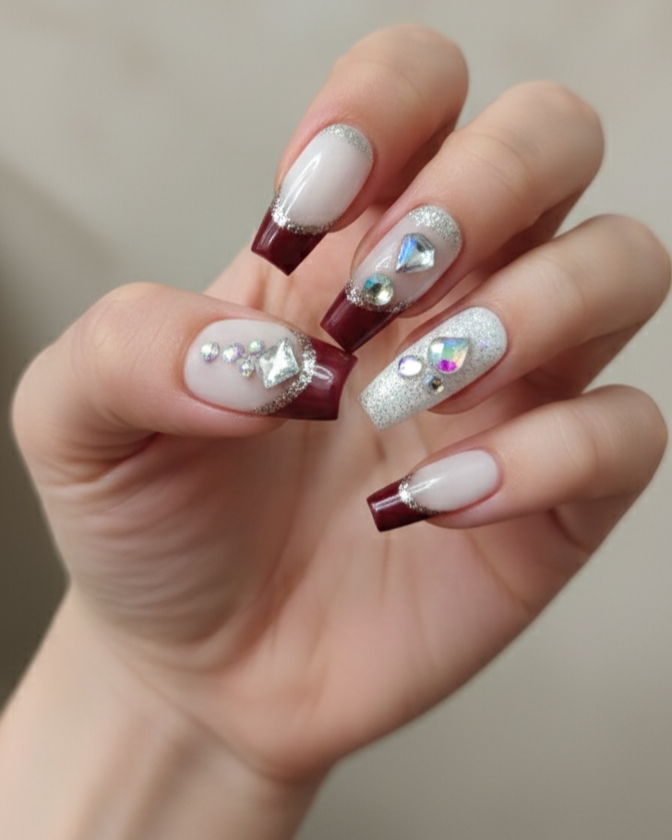ডিজাইন: ক্লাসিক ডিপ মেরুন ফ্রেঞ্চ টিপস (French Tips) সাথে সিলভার গ্লিটার আউটলাইন।