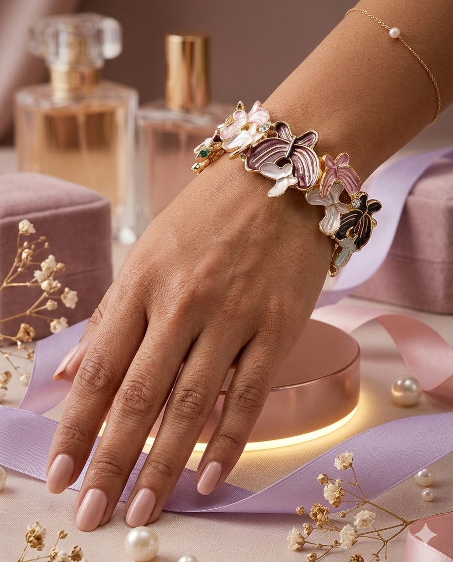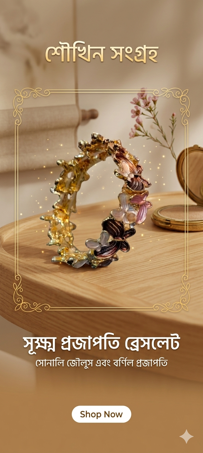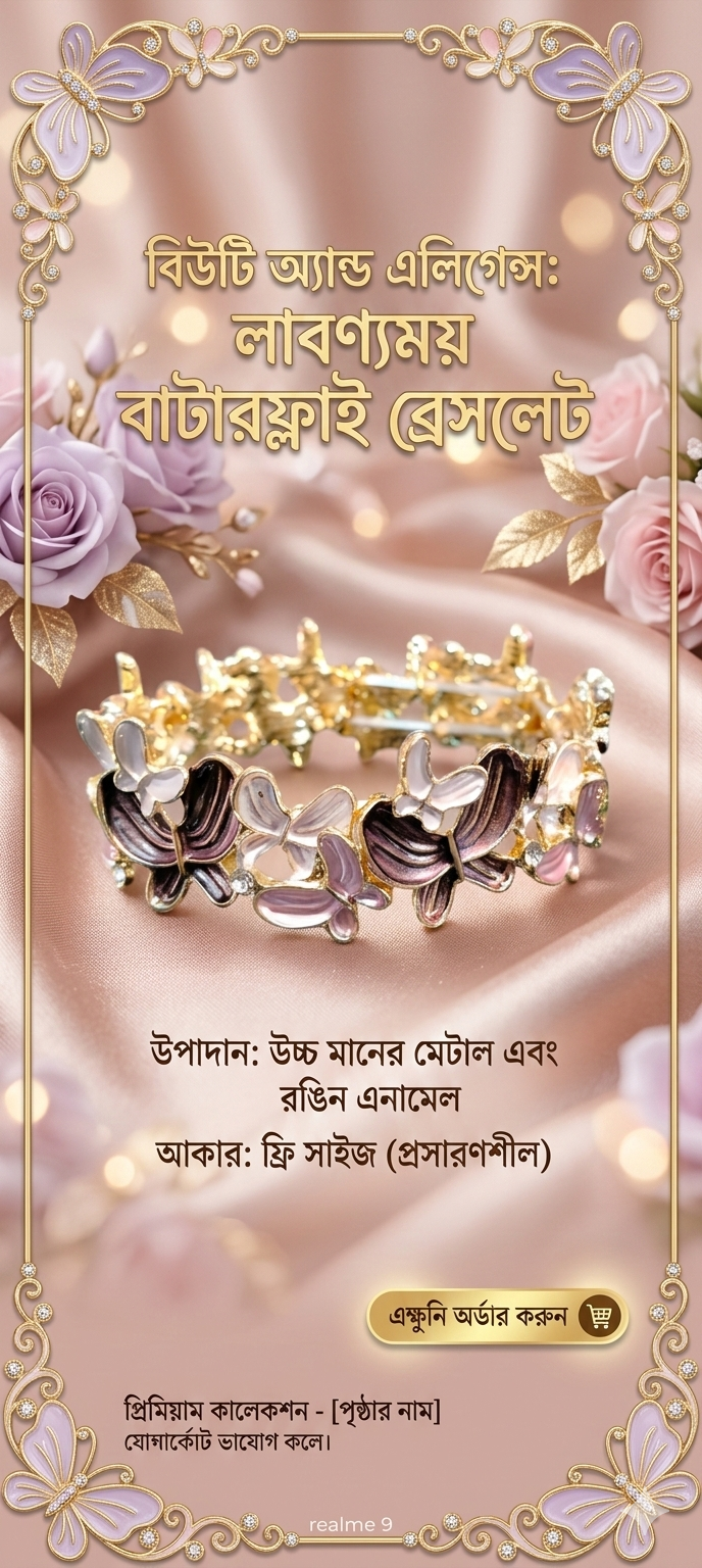 আপনার সাজে আভিজাত্য এবং প্রকৃতির ছোঁয়া যোগ করতে নিয়ে এলাম এই অনন্য প্রজাপতি মোটিফ ব্রেসলেট। এটি সাধারণ কোনো গয়না নয়, বরং একটি নিখুঁত শিল্পকর্ম।