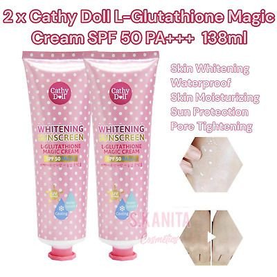 Product DescriptionCathy Doll L-Glutathione Magic Cream Whitening Sunscreen is not just a sunscreen, it is a skin brightening magic cream that can be used for both face and body. Dual Action: $SPF$ 50 PA+++ ensures protection and at the same time it is a whitening sunscreen with $L$-Glutathione extract. Instant Brightness: It helps to instantly increase skin brightness due to Titanium Dioxide. Cooling Effect: It has Cool Water Mist technology, which cools the skin even in intense heat and eliminates dryness. Useful: It is ideal for outdoor activities due to its light texture and water resistance.