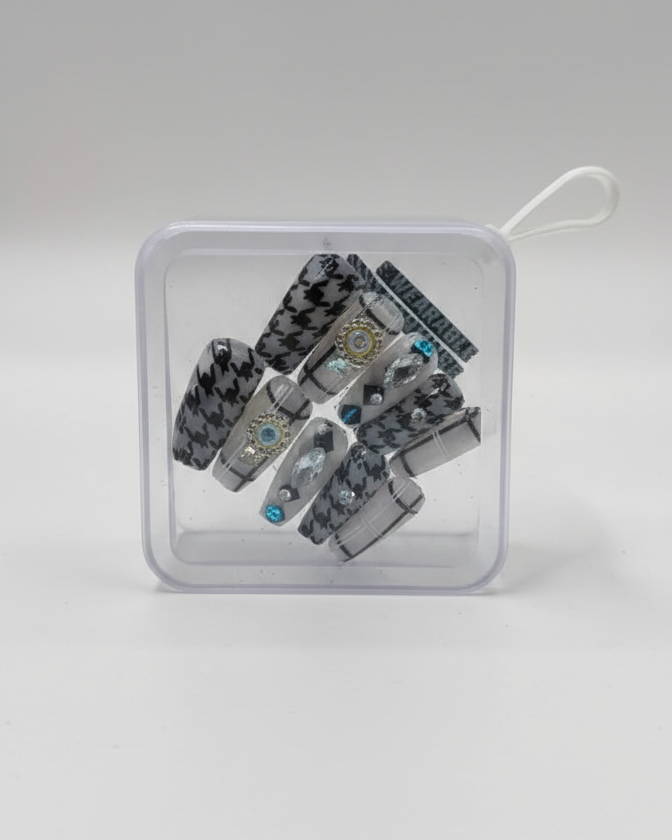 Decoration: Beautiful blue stone and shiny crystal embellishment on the middle nails.