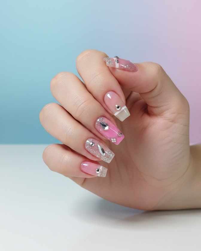 ডিজাইন: পিঙ্ক এবং হোয়াইট ফ্রেঞ্চ টিপস সাথে প্রিমিয়াম স্টোন এবং গ্লিটার ডিটেইলিং।