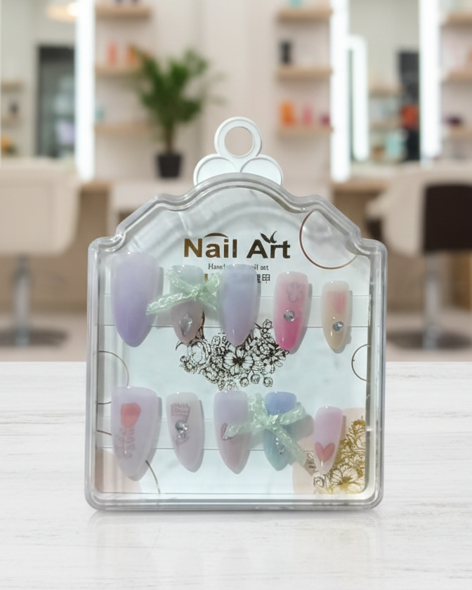আপনার নখকে ঘরে বসেই দিন স্যালন ফিনিশ লুক! আমাদের এই এক্সক্লুসিভ হ্যান্ডমেড প্রেস-অন নেল সেটটি তৈরি করা হয়েছে আধুনিক এবং মার্জিত রুচির কথা মাথায় রেখে। হালকা বেগুনি এবং পিঙ্ক শেডের সাথে এতে রয়েছে সুন্দর ৩ডি ফ্লাওয়ার, কিউট বো (Bow) এবং শাইনি স্টোন ওয়ার্ক।